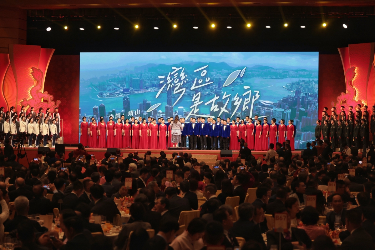 培僑中學的學生、杭州亞運健兒代表,與中央政府駐港聯絡辦、駐港國家安全公署、外交部駐港特派員公署、解放軍駐港部隊等中央駐港機構的員工代表,共同帶來合唱《灣區是故鄉》