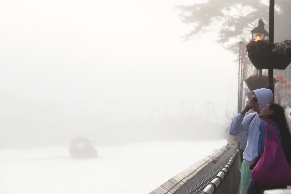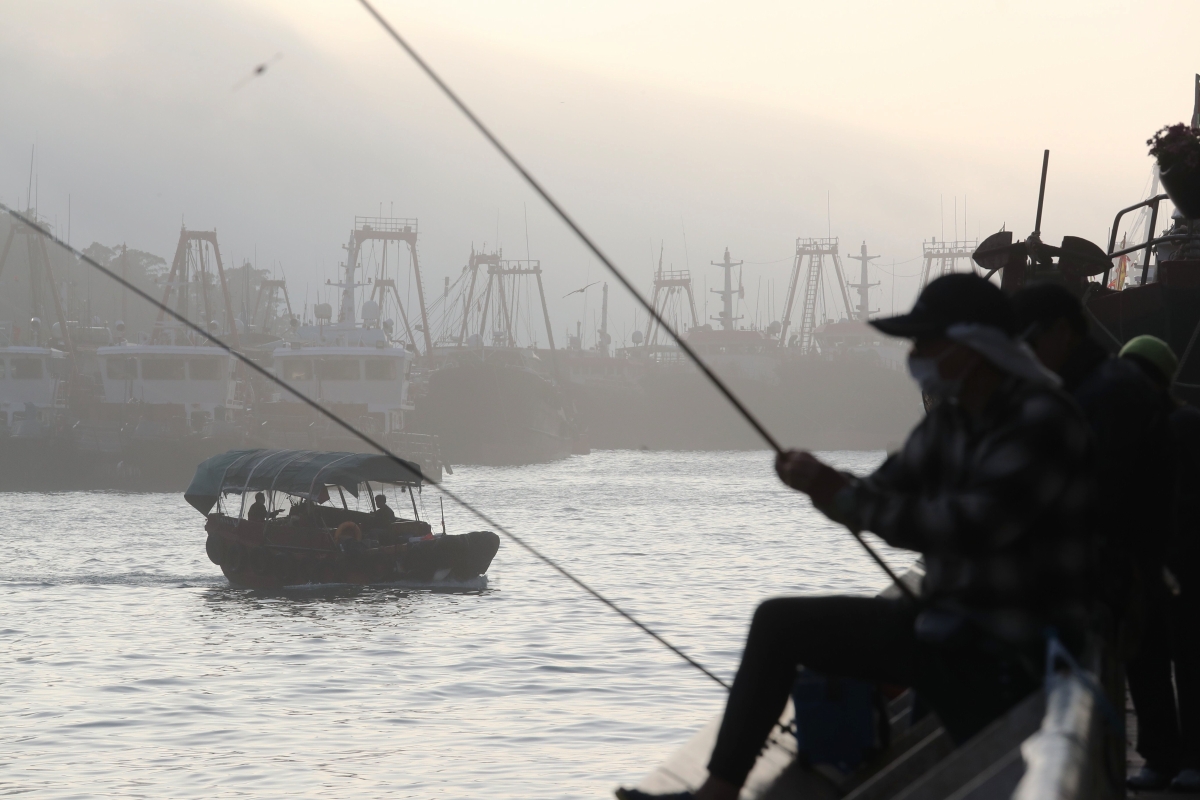 市民在香港仔避風塘霧色之中垂釣