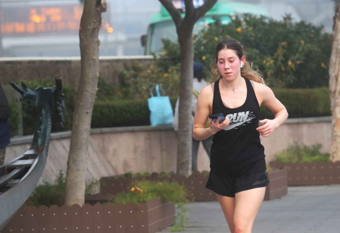 霧色下,喜愛運動的市民在海濱跑步