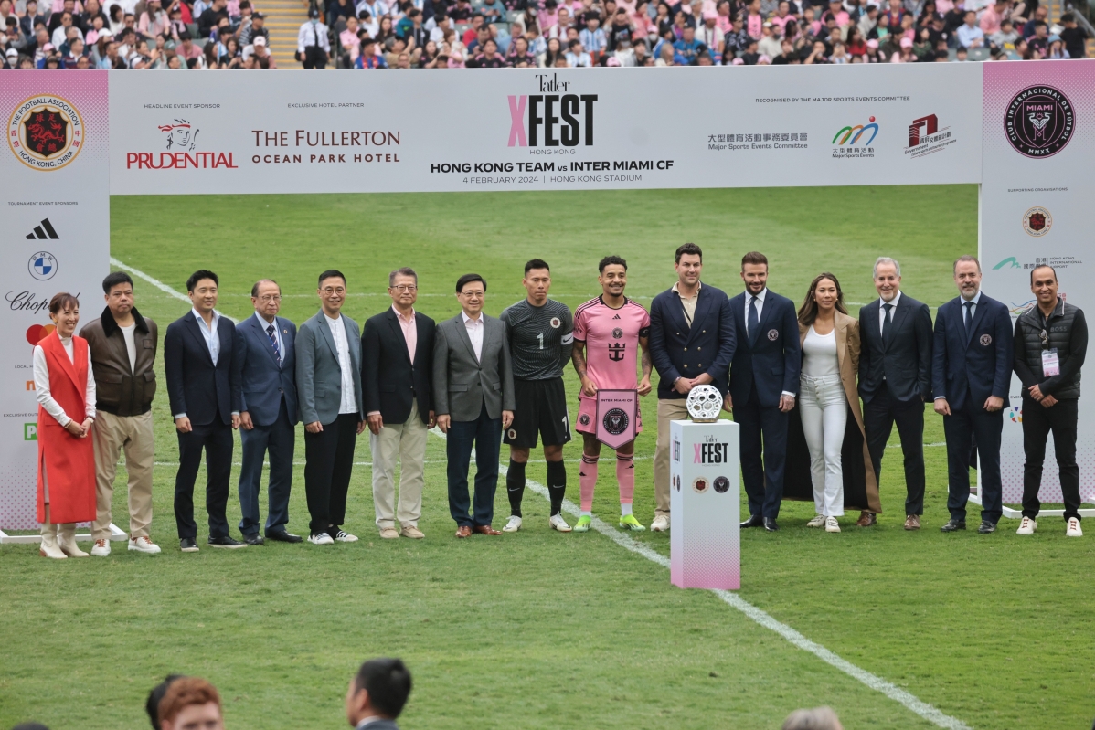 香港新聞網2月4日電(記者 謝光磊 )2月4日,阿根廷球王梅西率領的國際邁阿密隊下午4點在香港大球場與港隊進行友誼賽。香港特區行政長官李家超到場觀戰並為活動主禮。現場亦有舞龍和香港歌手表演。香港大批球迷到場為港隊打氣。行政長官李家超、財政司司長陳茂波、商務及經濟發展局局長丘應樺、文化體育及旅遊局局長楊潤雄等亦有到場觀賽。