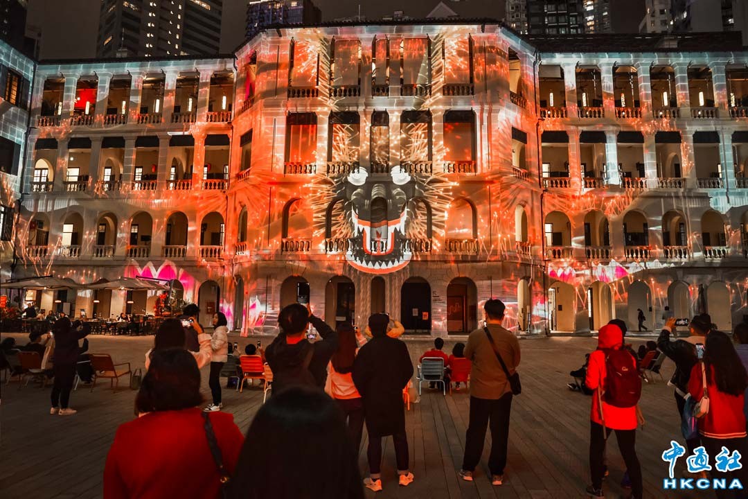 1月29日,踏入龍年之際,香港中環大館立體光雕投影節目《綻放大館》再度回歸,今年以《龍之歌》作主軸,巨龍投影在檢閱廣場“穿插”,猶如活生生的彩色巨龍,吸引大批市民前往觀看,為農曆新年添上節日氣氛。(香港中通社記者 謝光磊攝)
