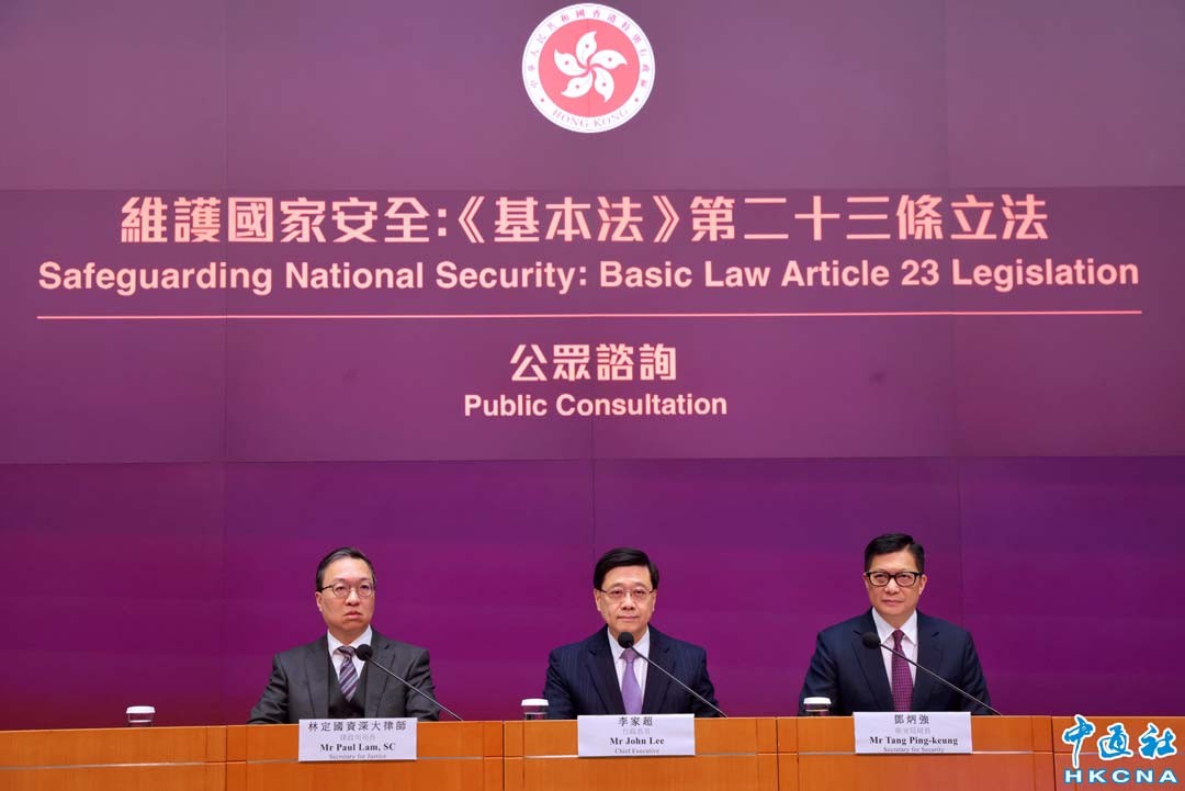 1月30日,香港特區行政長官李家超(中)主持“維護國家安全:《基本法》第二十三條立法公眾諮詢”記者會,宣佈即日起展開《基本法》第23條立法公眾諮詢工作。律政司司長林定國和保安局局長鄧炳強亦出席記者會。(香港中通社記者 謝光磊攝)