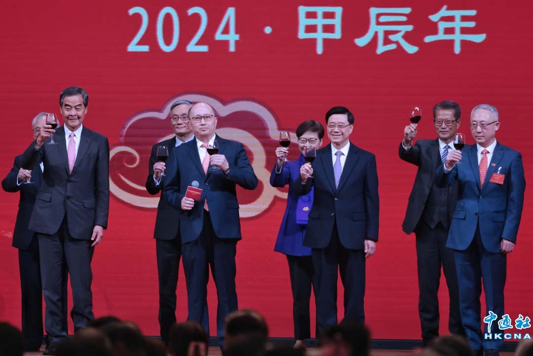 1月30日下午,中央政府駐港聯絡辦2024年新春招待會在香港會議展覽中心隆重舉行。中央政府駐港聯絡辦主任鄭雁雄、香港特區行政長官李家超發表致辭,全國政協副主席梁振英等嘉賓出席。圖為祝酒儀式。(香港中通社記者 謝光磊攝)
