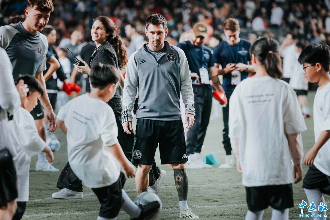 2月3日,阿根廷球王梅西帶領的球隊國際邁阿密在香港大球場進行公開訓練,為4日與港隊的友誼賽准備。有80名香港青少年足球梯隊學員,獲安排與國際邁阿密球員在訓練後進行交流。圖為梅西指導香港青少年足球梯隊學員。(香港中通社記者 謝光磊攝)