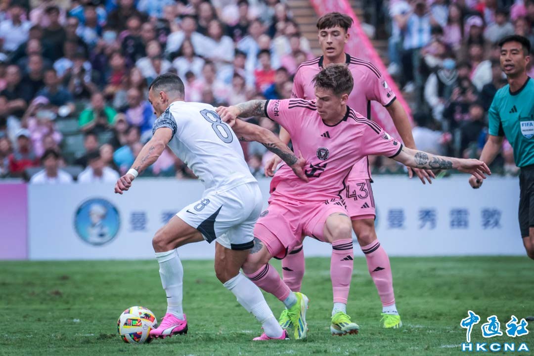 2月4日,阿根廷球王梅西率領的國際邁阿密隊下午4點在香港大球場與港隊進行友誼賽,國際邁阿密4∶1贏港隊,著名球星梅西、蘇亞雷斯全程未上場。圖為雙方球員在比賽中。(香港中通社記者 謝光磊攝)