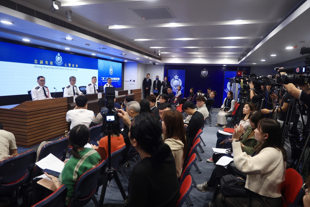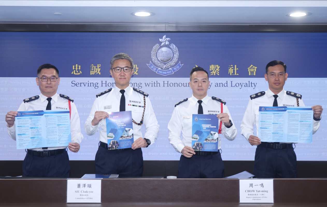 警務處處長蕭澤頤(左二)、警務處副處長(行動)周一鳴(右二)、警務處副處長(國家安全)簡啟恩(左一)及警務處副處長(管理)陳俊燊(右一)出席記者會