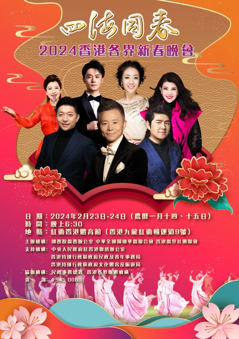香港新聞網2月6日電 由國務院僑務辦公室、中華全國歸國華僑聯合會和香港僑界社團聯會合辦的“四海同春”2024 香港各界新春晚會,將於本月23日和24日一連兩晚假座紅磡香港體育紅館隆重上演。演出的支持機構包括中央人民政府駐香港聯絡辦公室和香港特別行政區政府民政及青年事務局、文化體育及旅遊局;協辦機構為香港特別行政區政府民政事務總署和195個團體機構。