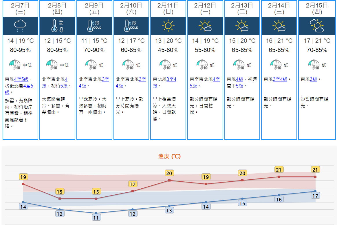 天文台表示,明日顯著轉冷及有幾陣雨,除夕及年初一早晚寒冷,最低氣溫約11度左右。農曆新年假期部分時間有陽光,日夜溫差較大。 (完)