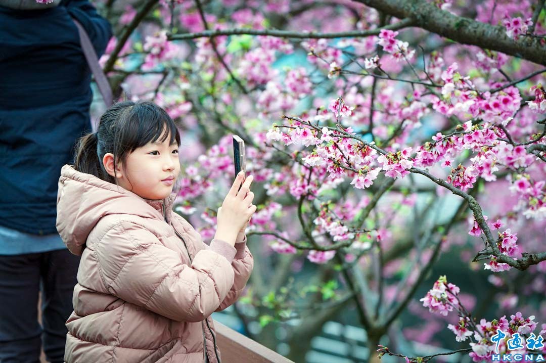 春節年假台北市東湖的樂活公園,櫻花盛開,不少遊客前往賞花拍照。 香港中通社圖片