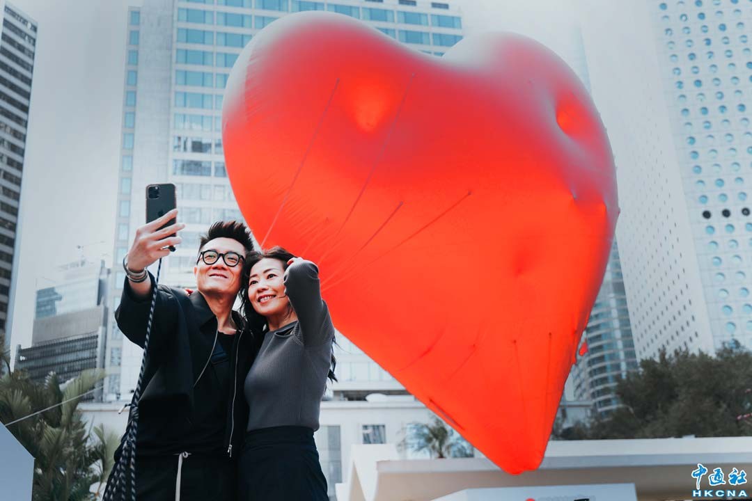 2月14日是情人節,直徑12米的巨型飄浮紅色心形裝置“Chubby Hearts”當日起在香港中環皇后像廣場花園展出,吸引了大批市民打卡拍照。(香港中通社記者 許其皓攝)