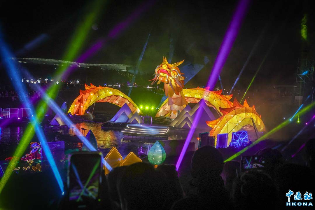 2024台灣元宵燈會2月16日晚間在台中水湳中央公園熱鬧開幕,長達76公尺的水中巨龍主燈“台中龍賀”點亮夜空,搭配發光立方體的旋轉拋接、水上載具動態展演,打造水上劇場機械主燈秀。 香港中通社圖片