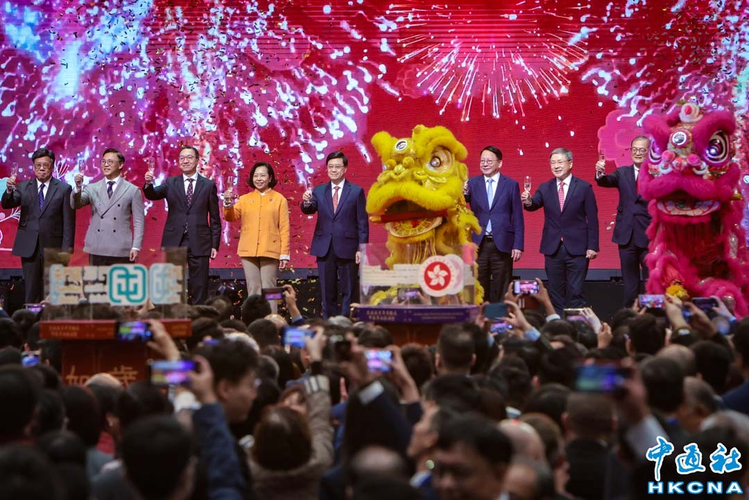 2月16日,香港特區政府民政及青年事務局舉辦甲辰年新春酒會,特區行政長官李家超出席。局長麥美娟致辭時表示,展望未來,新一年民青局的工作將以“家和萬事興”為主題。圖為李家超伉儷與多位司局長及官員出席酒會,由李家超主持祝酒儀式。(香港中通社記者 謝光磊攝)