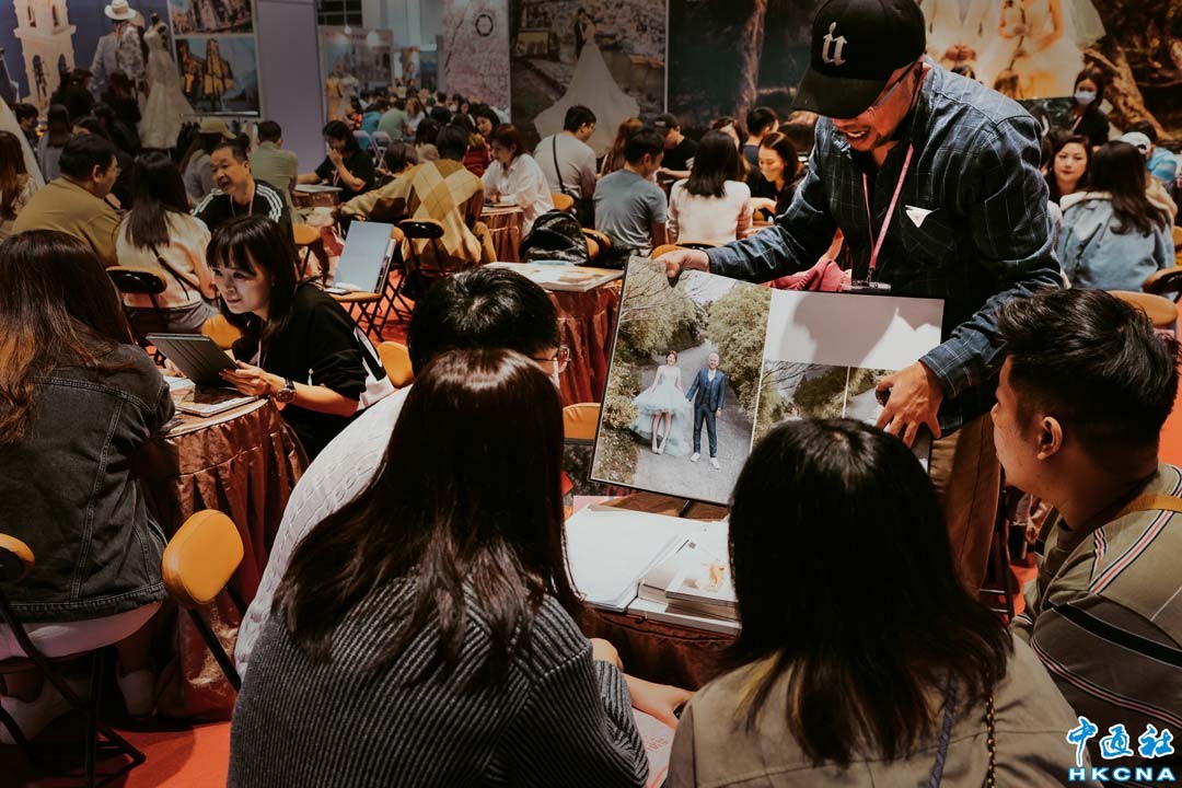 2月18日,龍年首個大型結婚節,第113屆香港結婚節暨2月婚紗展於香港會議展覽中心舉行,場內有逾300個展位,為準新人呈獻城中最熱門婚嫁精選優惠及禮遇,吸引大批市民前來參觀選購。圖為市民在選購婚紗照。(香港中通社記者 謝光磊攝)