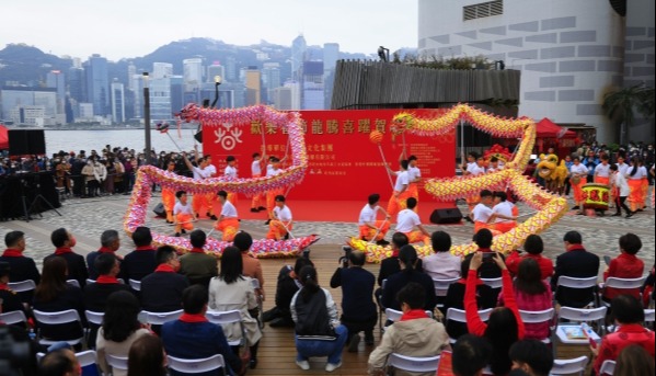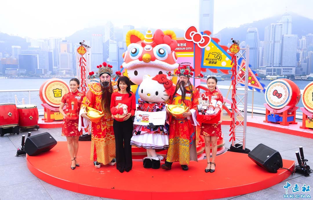 2月22日,香港海港城在海運觀點舉行“金龍獻瑞醒獅賀歲”活動,香港藝人鄭裕玲(左三)出席。(香港中通社記者 曹文毓攝)