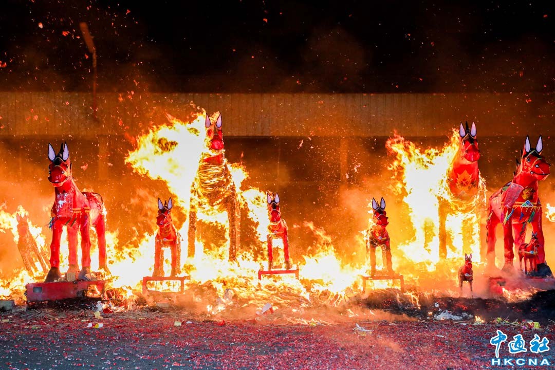 台灣嘉義縣鹿草鄉圓山宮年度盛事“火馬祭”於2月24日元宵夜登場,眾人齊心將火馬拉至燒馬場,引信點燃後烈焰沖天,火光四射,場面盛大。 香港中通社圖片