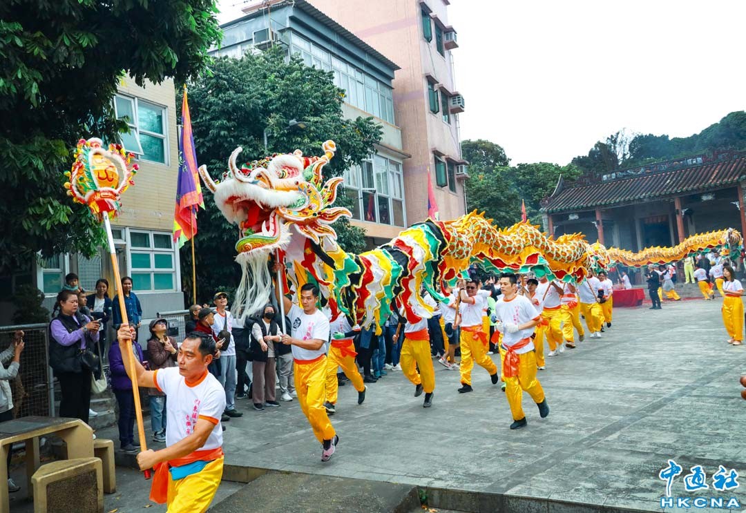 2月25日,香港新界廈村鄉東頭村鑼鼓喧天,人聲鼎沸,熱鬧騰騰。一條23節金龍在東頭村楊候宮前點睛起舞。金龍開光點睛後,隨即在廈村鄉穿梭巡遊,拜祠堂。緊接著在村內舉行武術表演,宴開100多圍盆菜並有歌舞助興,讓村裡村外街坊鄉里感受到圍村傳統文化和賀新春的熱鬧景象。 (香港中通社記者 洪少葵攝)