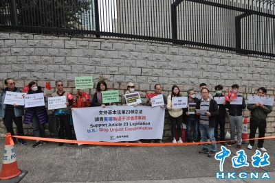 香港新聞網3月2日電(記者  謝光磊) 3月2日,香港有市民到美國駐香港總領事館外抗議,強烈譴責美國妄議抹黑基本法第23條立法,敦促美國立即停止干預香港事務。