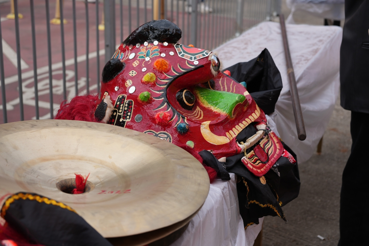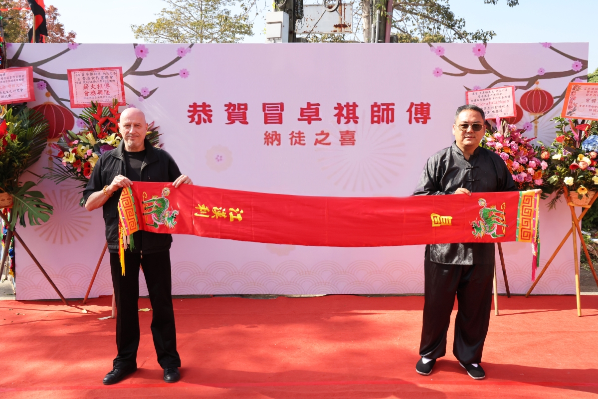 香港故事|一位比利時武者的中華文化求索之路香港冬日的一個早晨,來自萬里之外的比利時人江漢利先生專程到香港,向香港紮作業協會主席冒卓祺先生拜師,學習舞貔貅。一位香港紮作技藝傳承人,一位在比利時唐人街經營武館多年的中國功夫傳人,在社群集體的共同見證下,許下對傳承武學的承諾,更搭建起香港與比利時橫跨萬里的友誼之橋。正是這些極其細微但又非常重要的珍貴情誼,將人與人之間的距離拉近、定格、重塑。 儀典:拜師學藝 儀典舉行的那日沒出太陽,但天並不陰沉。我們驅車前往距離繁華市中心39公里的上水古洞煙寮區土地廟。沿途明澈寧靜的鄉村帶來一種似要呼之欲出但尚且無以名狀的隱秘的興奮。 我們按時抵達。儀典已準備就緒。冒卓祺師傅一身黑色中式衣衫,大步流星向我們走來,送上熱情的問候。江漢利一襲黑衣,身邊站著妻子和他的七個徒弟,他們身著紅色衣衫,上面黑金描邊字樣寫著“駱桂平”三字。周遭熙熙攘攘,嘉賓、講者、主持人、攝影師、各路朋友和見證人在巨大的花牌下走動著,等待儀典開始。 江漢利令人印象深刻,在人群中能夠輕易找到他。他臉上依稀可見白色鬍子,神情專注,目光清澈明亮。冒師傅走上前,與他確認事宜。今日儀典的兩位主角就位。