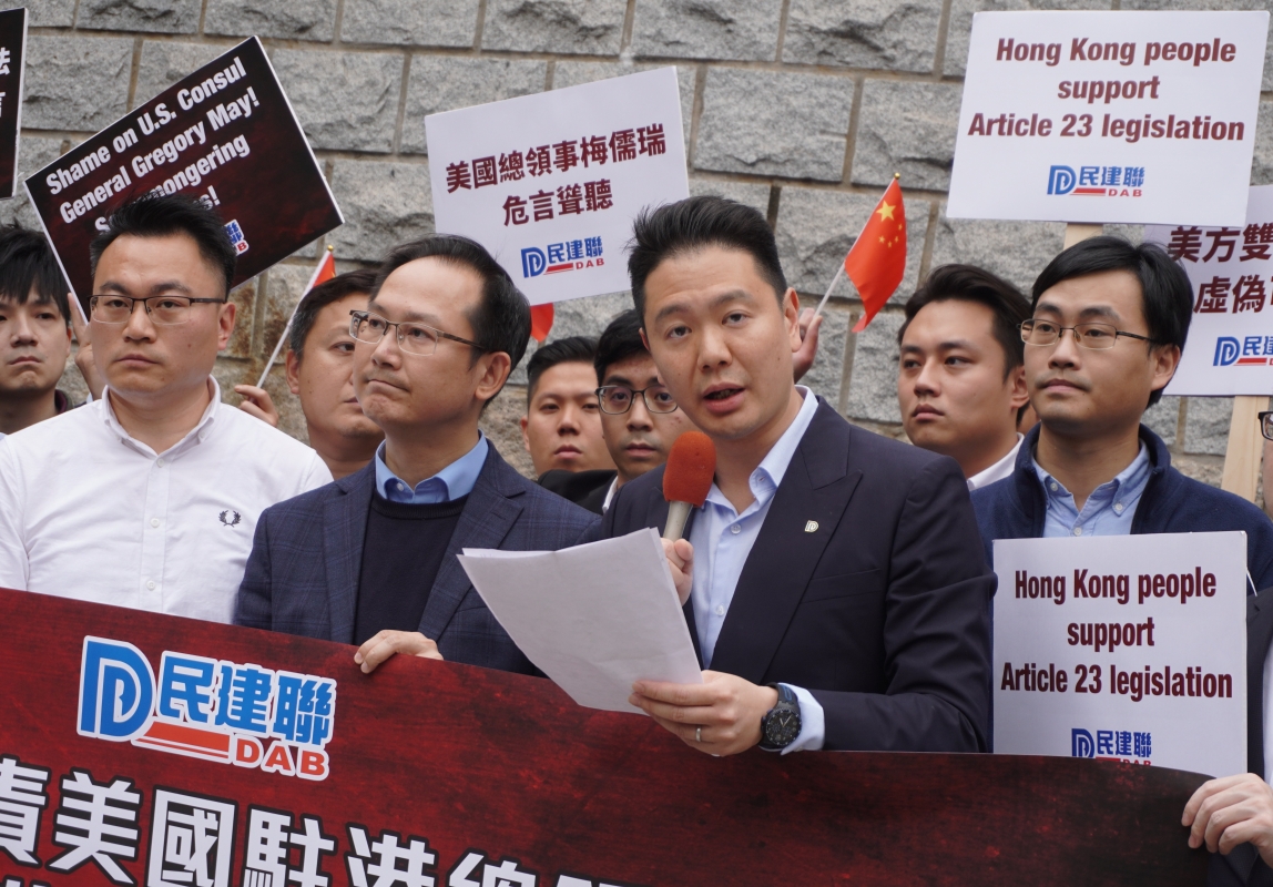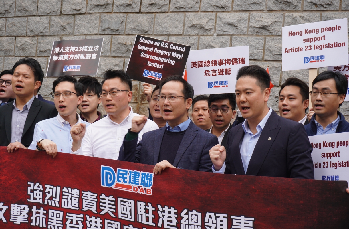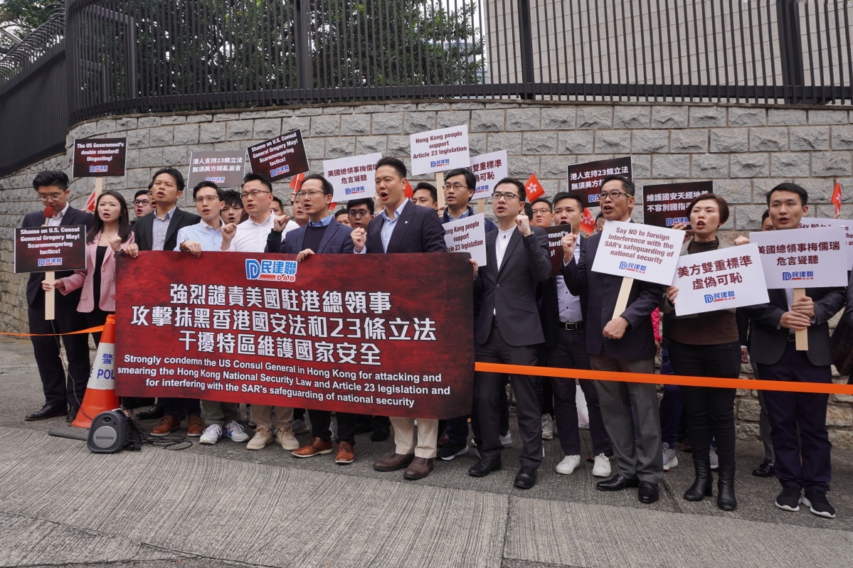 民建聯成員在美國駐港總領事館前抗議