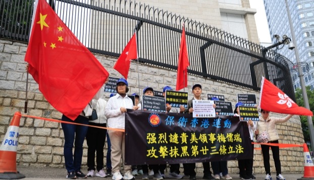 香港新聞網3月6日電(記者 曹文毓)  3月6日,香港市民和團體陸續到美國駐港總領事館前抗議。當天下午,一眾香港市民及民建聯成員先後在美國駐港總領事館前抗議,強烈譴責美國駐港總領事攻擊抹黑香港國安法和23條立法,干擾特區維護國家安全。