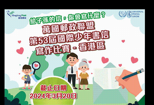 圖源:香港郵政網站。 參賽規則 今屆比賽的題目為“150年來,萬國郵政聯盟在全球為超過八代提供服務。自那以後,世界發生了巨大的變化。給子孫後代寫一封信,暢想你們希望他們繼承一個什麼樣的世界。” 參賽者須為15歲或以下〈截至2024年3月20日〉在香港就讀的中學生。 每位參賽者只可遞交一份作品。 作品須以中文書信形式撰寫,不可多於800字。 作品必須以400格直行原稿紙手寫或以電子檔(WORD格式)遞交。請將參賽作品連同已填妥的參賽表格,於2024年3月20日或之前郵寄至香港郵政總局郵政信箱11779號或電郵至upu_letter_writing@hkpo.gov.hk。郵寄稿件以郵戳為準,逾期稿件恕不受理。請確保付足郵資。本地小型信件重量不超過30克,郵費為2.20港元;重量不超過50克,郵費為3.30港元。大型信件重量不超過50克,郵費為4.10港元。有關本地郵件的郵費,可瀏覽網址。 獎項 獲甄選作品(1名):書劵港幣2000元及獎狀 優異獎(10名):書劵港幣300元及獎狀 評審團 由教育局、專上學院及香港郵政代表組成。 截止日期 2024年3月20日 賽果公布 結果將於2024年4月在香港郵政網頁公布。得獎者將獲另函通知。 參賽表格 請按此下載。 如有查詢,可電郵至upu_letter_writing@hkpo.gov.hk。(完) 【編輯:譚暢】