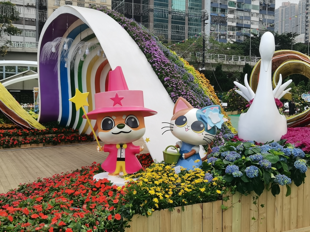 花展分為東西文化區,涵蓋了東方神話《阿拉伯神話》《西遊記》及西方童話《綠野仙蹤》《傑克與豌豆》,花展邀請到了來自香港各區、北京、上海、深圳、廣州、杭州等地的花卉參展,呈現出的文化和自然的多樣性令人驚豔。此外,展覽還展示了政府部門的各項創新項目,以花卉為媒介,賦予了都市景觀全新的生機和活力。 名為“綠野仙蹤”的主題展區,以童話故事情節為主線,運用花卉藝術創作出稻草人、鐵樵夫和獅子等形象。非洲鳳仙、如意皇后、半邊蓮等豐富的花卉,組成了一道道炫彩的花瀑,猶如真實的彩虹從天空垂落。若凝神細看,還能見到兩個活潑的小傢伙——“活力仔”與“文思喵”,他們手執星星魔杖,穿梭在由童話故事與花卉編織的浪漫花園之中,充滿了異域情調,猶如走進了一個魔法的世界。