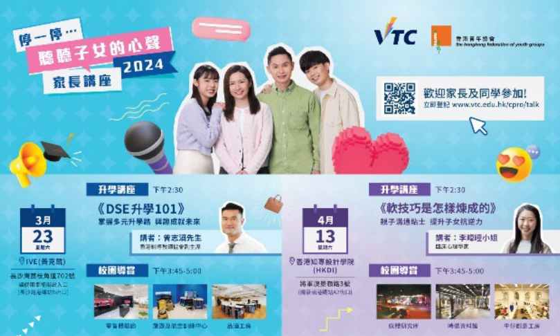 現今升學出路豐富多元,只要跟隨自己性格及能力選科,從興趣出發,定可找到最合適的出路。首場講座《DSE升學10》將於3月23日(星期六)舉行,由香港輔導教師協會副主席曾志滔講解最新升學資訊及分析數據,解答家長有關升學的難題,協助家長與子女共同創建屬於他們的未來。家長及同學可親臨香港專業教育學院(IVE)黃克競院校參與講座。活動當日特設校園導賞,由專人安排參觀IVE(黃克競)物聯網技術中心、旅遊及航空訓練中心,以及零售體驗廊等教學設施。 第二場講座《軟技巧是怎樣煉成的》則於4月13日(星期六)舉行,家長及同 學可親臨香港知專設計學院(HKDI)參與。情緒健康議題近年備受社會關注,守護子女精神健康的路上,家長角色尤其重要。臨床心理學家李暐曈將分享親子有效溝通之道和實用小貼士,並協助家長及早識別子女潛在的情緒問題、培養子女的解難力、應變力、溝通技巧等軟技巧,藉此提升抗逆力。講座後將由專人安排參觀HKDI教學設施,包括Media Lab媒體研究所、時裝資料館、牛仔創意工房等。 “停一停…聽聽子女的心聲 ” 家長講座費用全免,歡迎家長及同學報名參加。有興趣人士可於網上登記或致電2836 1888查詢。(完) 【編輯:譚暢】