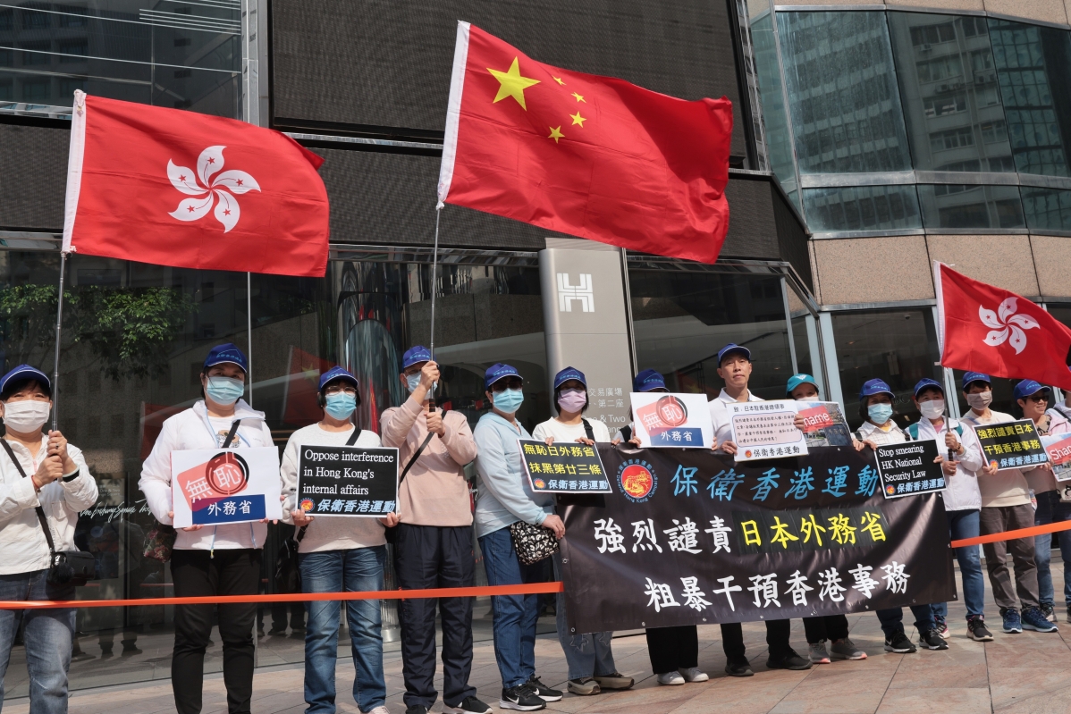 香港新聞網3月21日電(記者 謝光磊 ) 3月21日,香港市民及民間團體陸續到日本駐港總領館抗議,市民手持“23條立法天經地義”、“中國內政不容干預”等字樣的橫幅,強烈譴責日本妄議香港《維護國家安全條例草案》立法,干涉中國內政。