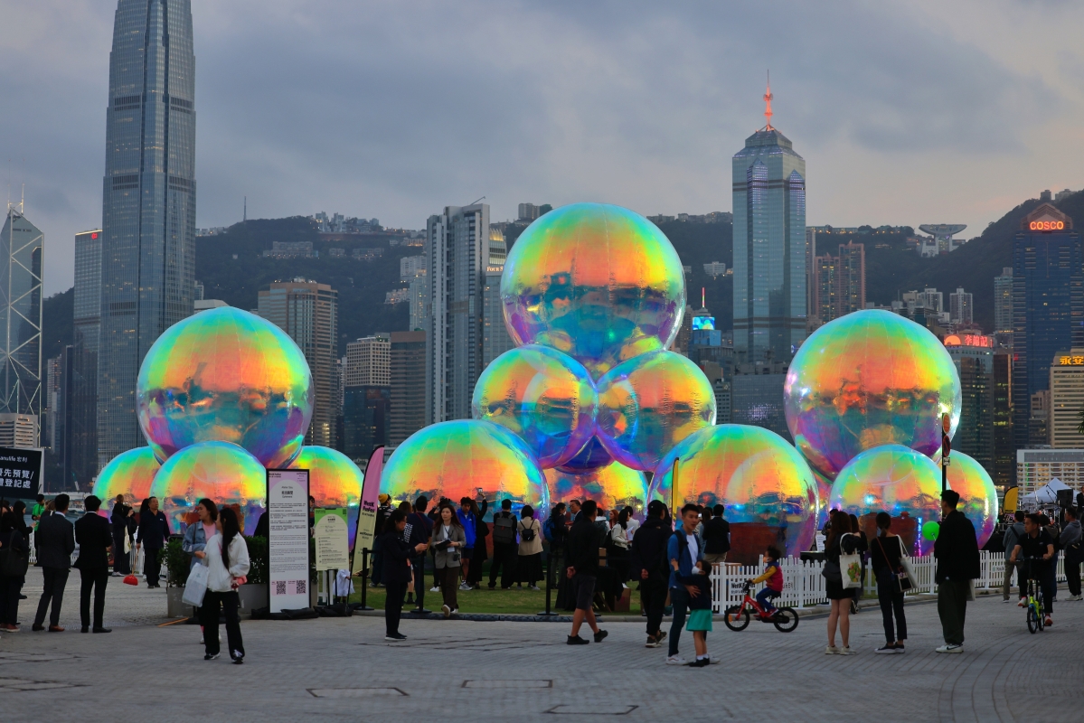 巨型肥皂泡泡造型裝置融入維港海景,吸引市民打卡 市民打卡藝術裝置