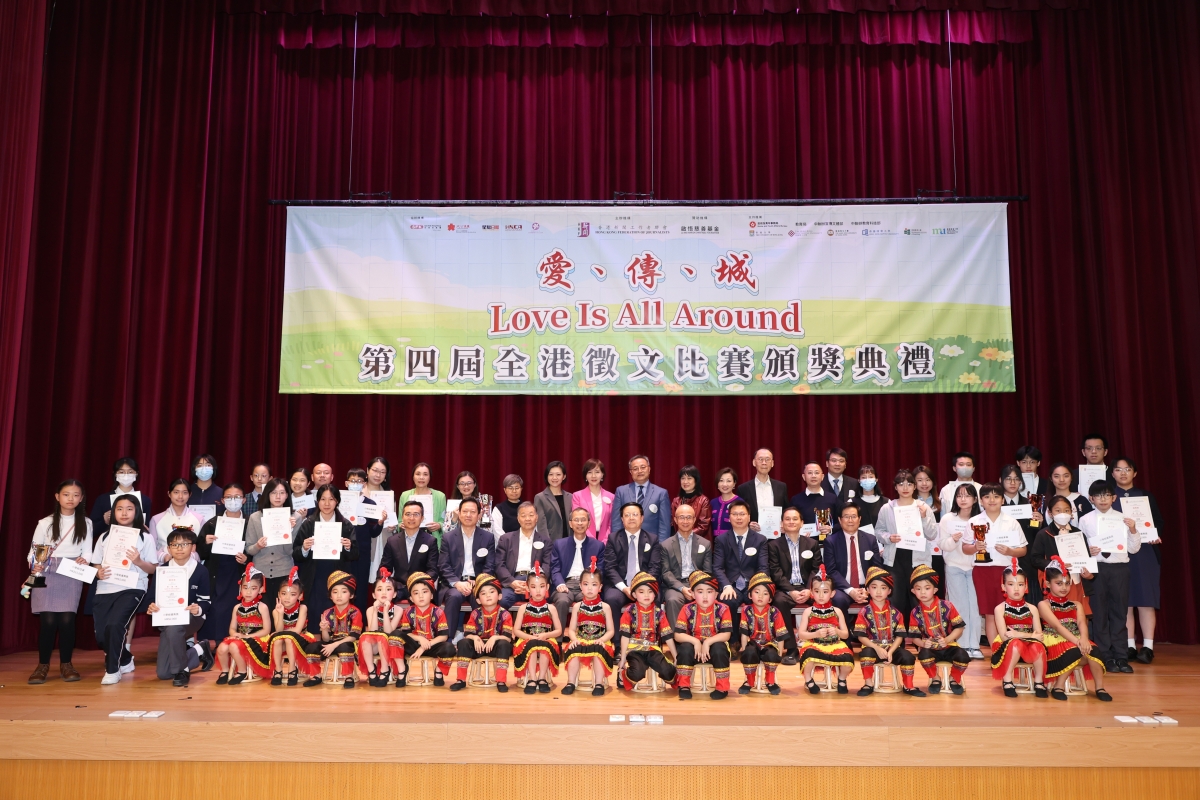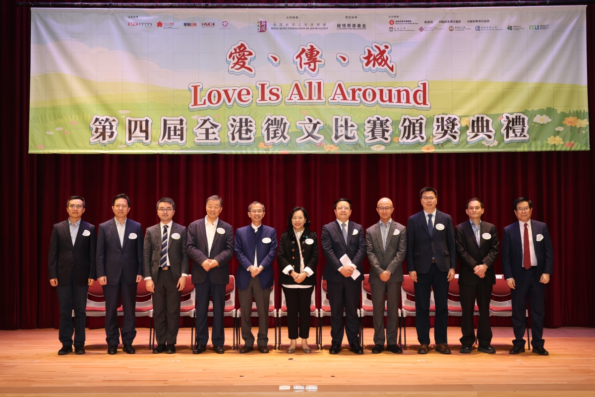 香港新聞網3月22日電 由香港新聞工作者聯會主辦、啟悟慈善基金贊助的“愛、傳、城 Love Is All Around”第四屆全港徵文比賽頒獎典禮於3月21日(星期四)在灣仔禮頓山社區會堂舉行。主禮嘉賓包括特區政府民政及青年事務局局長麥美娟,全國政協委員、香港新聞工作者聯會主席李大宏,前香港立法會主席曾鈺成,香港新聞工作者聯會會長張國良,敎育局副局長施俊輝,中聯辦教育科技部處長方磊,啟悟慈善基金創辦人羅啟瑞等。比賽繼續得到教育局、民政事務局、中聯辦宣傳文體部、教育科技部,以及香港多間大學和機構的支持。