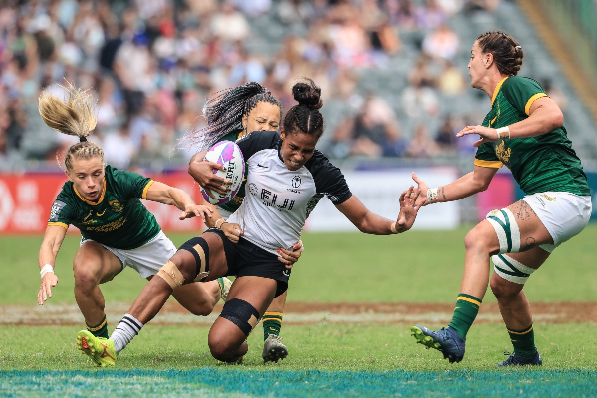 圖為斐濟女子隊(白)戰勝南非女子隊(綠)