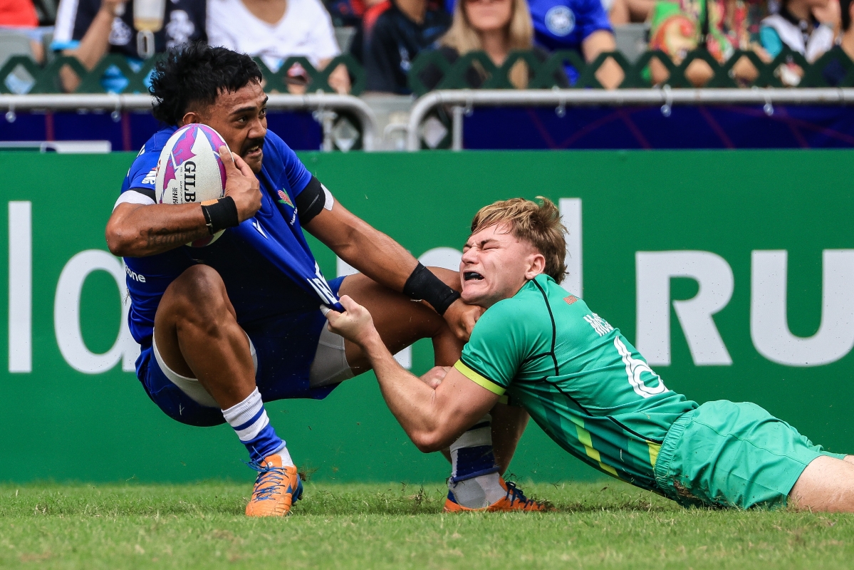 圖為愛爾蘭男子隊(綠)戰勝薩摩亞男子隊(藍)