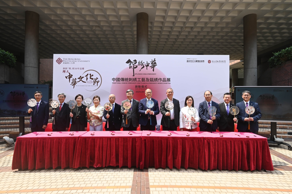 港理大中華文化節推廣中國傳統刺綉工藝文化香港新聞網4月10日電 香港理工大學中華文化節以中國傳統刺綉工藝文化為主題,由10日起至4月23日開展第二波精彩活動──“錦綉中華 — 中國傳統刺綉工藝及甌綉作品展”,並舉辦講座、工作坊及展覽導賞等,弘揚中華文化及非遺工藝的魅力。 是次展覽由理大主辦,溫州市文化廣電旅遊局及浙江工貿職業技術學院協辦。活動啟動儀式於今天舉行,由理大校董會主席林大輝博士、校長滕錦光教授、溫州市文化廣電旅遊局黨組書記及一級調研員張志宏先生、浙江工貿職業技術學院副校長汪焰教授、浙江工貿職業技術學院高級工藝美術師兼浙江省工藝美術大師鄒繩珠女士,以及理大大學顧問委員會主席顏吳餘英博士、大學管理層及學院院長,為展覽揭開序幕。