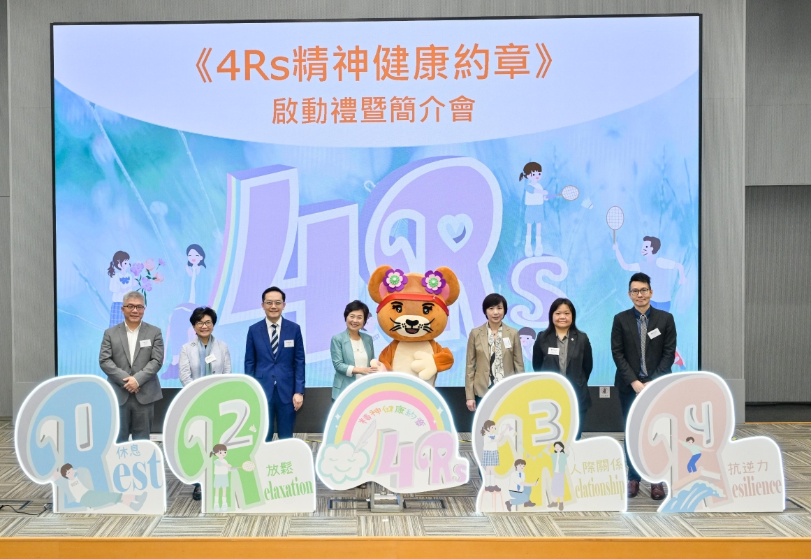 圖源:政府新聞處。 為更全面、有系統地推廣校園精神健康,她呼籲全港學校齊心響應參加《約章》,一起訂立切實可行的目標,採取具體行動,促進學生身心健康。 《約章》中的“4Rs”涵蓋四個促進精神健康的要素及目標,對促進學生精神健康同樣重要,同時互相有密切的關係。4Rs是指: (一)休息(Rest):協助學生從小建立健康的生活習慣,有足夠的休息、充足的睡眠和休閒的活動。 (二)放鬆(Relaxation):教導學生適時放鬆,關顧精神健康及懂得自我關懷。 (三)人際關係(Relationship):加強同儕、師生,以及家長與子女之間的關係,提升聯繫感;幫助學生明白自己在不同關係的角色及其重要性,願意承擔責任並作出貢獻。 (四)抗逆力(Resilience):裝備學生適應生活中無可避免的壓力和挫折,教導學生以正面的態度處理情緒、應對壓力和克服困難。 在啟動禮上,蔡若蓮博士及衞生署署長林文健醫生由衞生署的吉祥物“郁獅”陪同,與一眾嘉賓進行伸展運動,放鬆身心。出席啟動禮的其他主禮嘉賓包括中、小學學校議會及校長會代表,以及現階段《約章》的夥伴機構代表,包括香港賽馬會慈善信託基金、香港紅十字會、香港心理衞生會、愛望基金和青少年發展企業聯盟。此外,十八區校長會和全港官立學校亦參與啟動禮,積極響應《約章》,群策群力促進學生的身心健康。 參加《約章》的學校須在2024/25學年起落實各項推廣學生精神健康的措施和舉辦活動,協助學生建立健康的生活習慣,為學生提供更多放鬆減壓的機會,幫助學生建立正面的人際關係,加強他們的幸福感及抗逆力,從而提升學校整體的健康文化。學校亦須每年舉辦推廣正向家長教育的家長教育課程或親子活動,向家長分享培養正向孩子的方法。 參與《約章》的學校會同時簽署由衞生署、勞工處和職業安全健康局聯合推行的《精神健康職場約章》,為教職員提供精神健康友善的工作環境。此外,為使學校可以持續、全面和有效地推行健康推廣工作,參與《約章》的學校亦會同時參加全校園健康計劃,按照校本情況制定策略推廣校園健康。 《約章》詳情可參閱教育局通函第60/2024號和《4Rs精神健康約章》專頁。 教育局籲請全港學校盡快參加《約章》,為學生每天的生活注入幸福感,為他們的健康成長共同努力。教育局會繼續透過跨部門及跨界別合作,加強協同效應,幫助學校善用校外及社區資源,強化推廣學生精神健康的工作。 (完) 【編輯:譚暢】