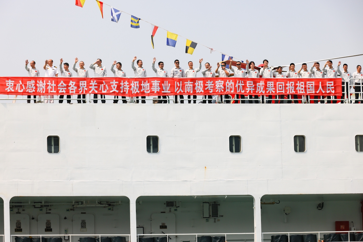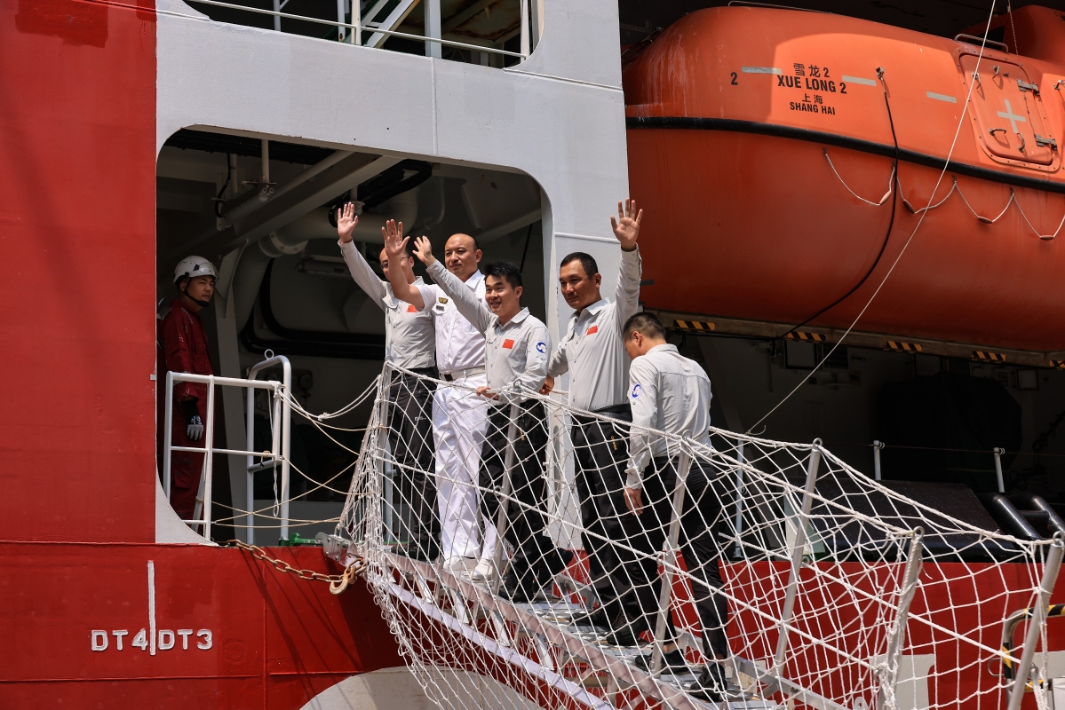 中國第40次南極考察隊副領隊魏福海及“雪龍2”號代表與市民揮手道別
