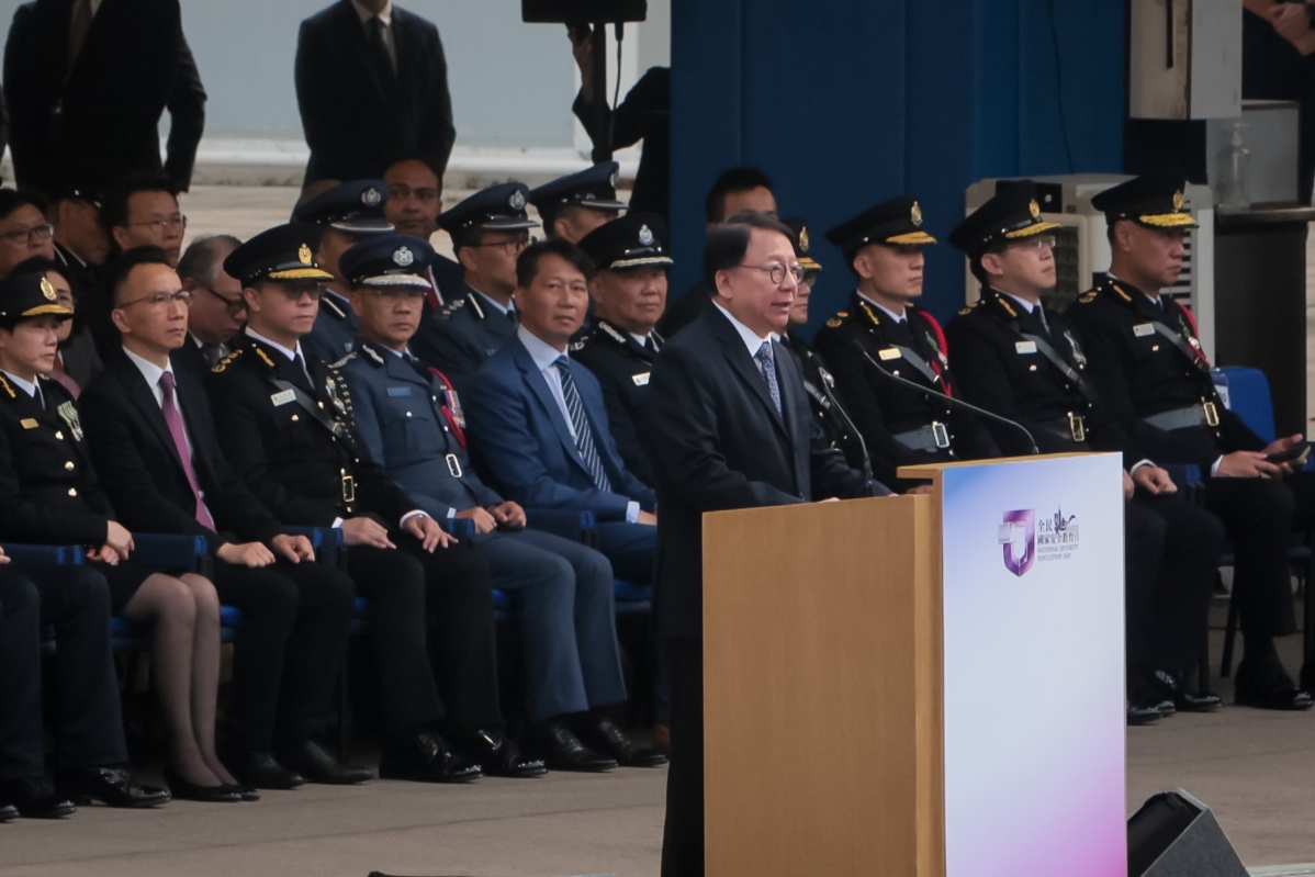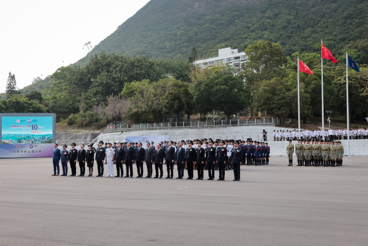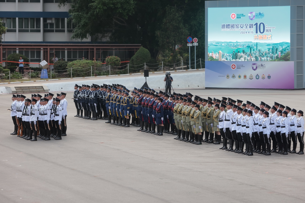 香港新聞網4月15日電(記者謝光磊)4月15日, 為響應“全民國家安全教育日”,為響應“全民國家安全教育日”,香港特區保安局帶領轄下紀律部隊在香港警察學院聯合舉行升旗儀式,由政務司司長陳國基主禮。保安局局長鄧炳強、警務處處長蕭澤頤、海關關長何珮珊等紀律部隊首長出席。升旗儀式開始前,警察銀樂隊在場奏樂,之後各紀律部隊代表步操進場列隊。升旗儀式於早上7時50分開始,警察護旗方隊進場,現場奏唱國歌,並進行升旗。