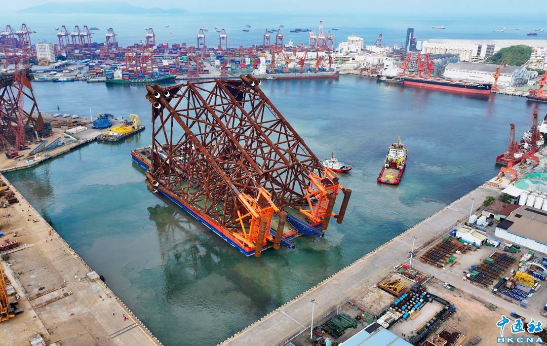 4月16日上午,廣東省深圳市,由海洋石油229船拖運的惠州26-6DPP導管架在深圳赤灣勝寶旺場地碼頭啟航,駛向距離深圳市東南約160公裡的惠州油田海域。本次拖航出海進行海上安裝的惠州26-6DPP導管架,高達131米,重達14056.64噸。圖為導管架拖航出海現場。(聞子 攝)