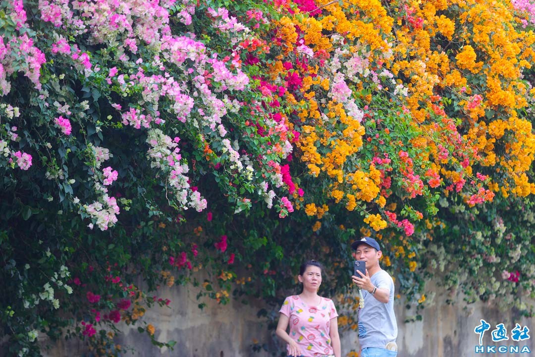 台灣彰化市禾家牧場附近水月台路的七彩九重葛盛開,長達百公尺長的花牆瀑布,放眼望去至少有5、6種繽紛花色,沿著高牆垂墜,有如七彩瀑布傾瀉而下,又像披上彩色圍巾,遊客驚艷打卡留念。 香港中通社圖片