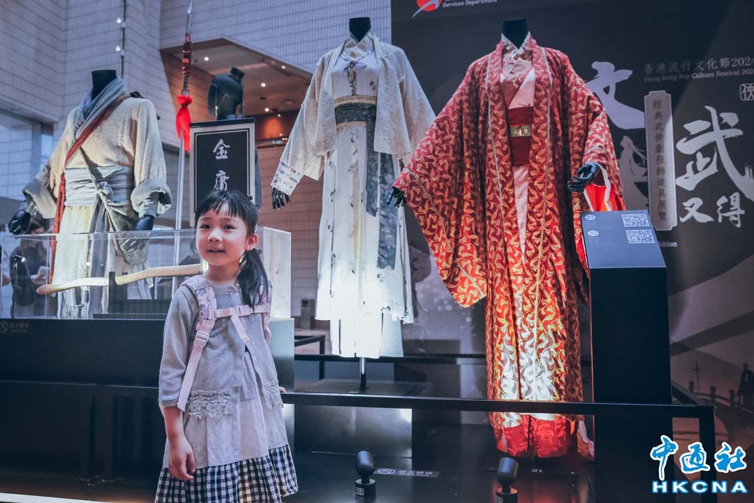4月20日,由香港康樂及文化事務署主辦的第二屆香港流行文化節以“也文也武”為主題,備有多項精彩活動,其中“文又得武又得”系列的“經典武俠劇服飾道具展覽”於香港文化中心地下大堂舉行,展示約三十件由七十至千禧年代電視武俠劇的頭飾、服裝和道具。圖為小朋友參觀展覽。(香港中通社記者 謝光磊攝)