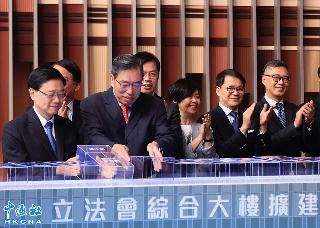 4月23日,香港立法會綜合大樓擴建平頂儀式舉行,香港特區行政長官李家超、香港立法會主席梁君彥等嘉賓出席。(香港中通社記者 曹文毓攝)