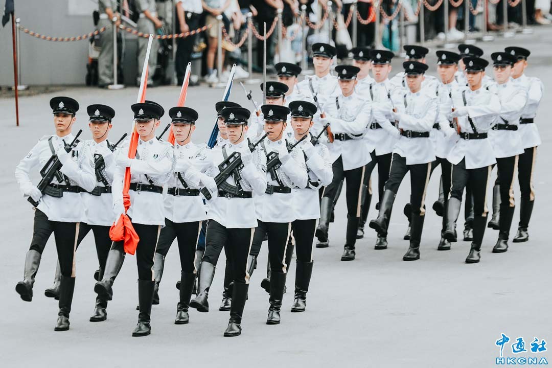 香港警察學院4月27日舉行結業會操,香港金融管理局總裁余偉文在典禮中檢閱畢業的見習督察和學警。圖為護旗方隊入場。(香港中通社記者 許其皓攝)