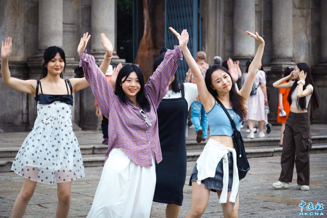 澳門特區政府為應對“五.一黃金周"居民及訪澳旅客的出行需要,交通事務局日前與治安警察局、海關、巴士公司、博企、酒店及陸路跨境客運公司代表舉行協調會議,部署相關交通安排及應急預案;並於4月30日至5月5日,對澳門各口岸和預計有大量人流及車流集結的地點實施多項臨時交通安排詳。圖為近日遊客在大三巴景點起舞。(香港中通社記者 洪少葵攝)