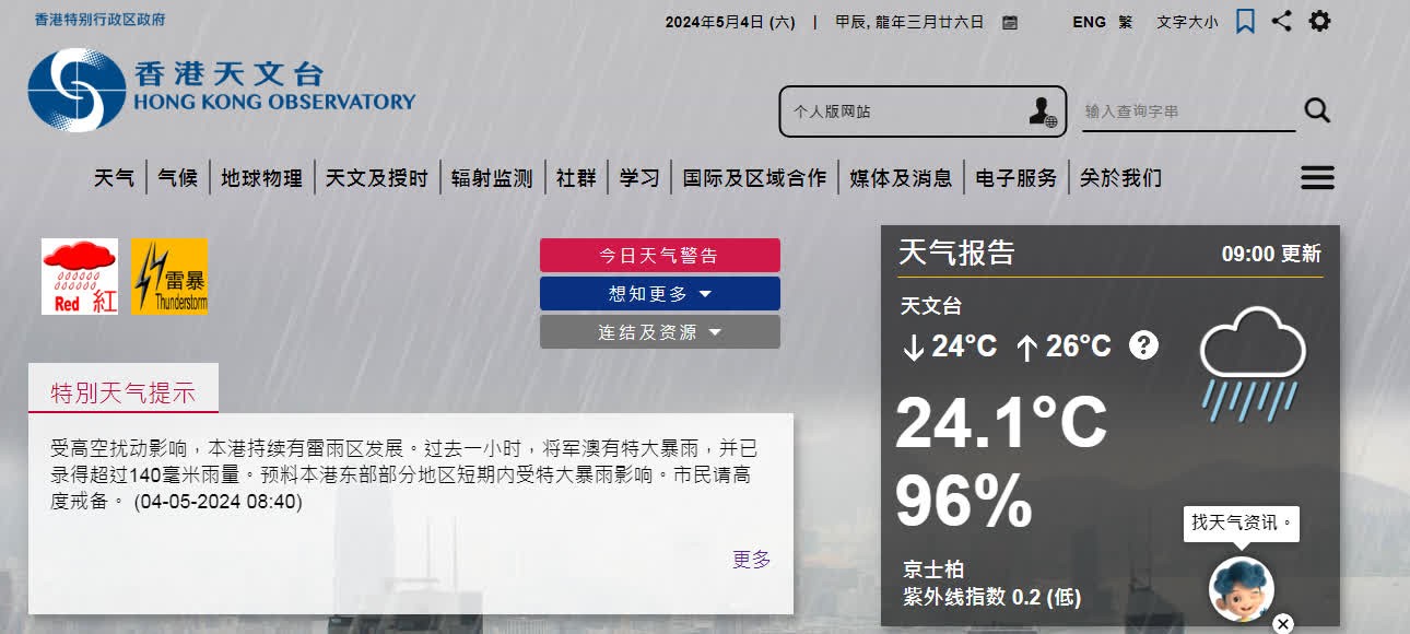 香港新聞網5月4日電 香港天文台於今天(5月4日)上午8時55分發出紅色暴雨警告信號。