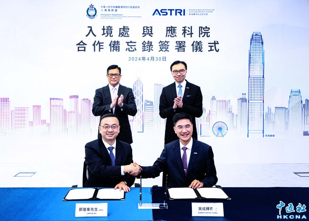 香港特區政府入境事務處與香港應用科技研究院4月30日舉行新聞發佈會,並正式簽署合作備忘錄,攜手研發各種適用於出入境服務的創新科技,以進一步提升通關效率,為市民及旅客帶來更佳的出行體驗。圖為香港特區政府保安局局長鄧炳強(後排左)、香港入境事務處處長郭俊峯(前排左)、香港應科院董事局主席李惠光(後排右)和香港應科院行政總裁葉成輝(前排右)出席簽署儀式。(香港中通社記者 許其皓攝)