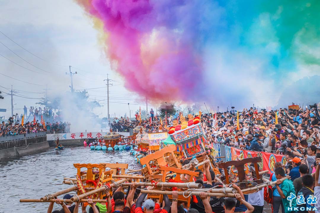 台灣嘉義縣布袋鎮新塭嘉應廟5月5日舉辦年度宗教盛事“衝水路、迎客王”,信眾們和友宮神轎一早就聚集在王船碼頭,隨著衝水路儀式正式開始,眾人扶轎下水,場面嗨翻天,大家手持清香祈求風調雨順,百姓平安。 香港中通社圖片