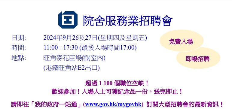 香港新聞網5月10日電 香港特區政府勞工處將於5月14日為15至24歲副學位或以下的青年舉辦“青年搵工日@展翅青見計劃”,提供超過2000個適合青年求職者的全職及兼職在職培訓職位空缺。 招聘會於旺角麥花臣場館舉行,共有33間機構參與,涵蓋運輸、航空服務、酒店、主題公園、公用事業、零售、飲食及物業管理等不同行業,提供超過2000個適合青年求職者的全職及兼職在職培訓職位空缺。