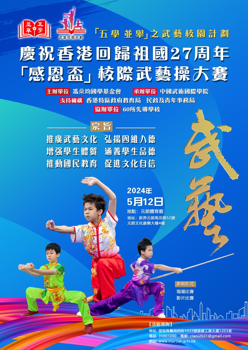香港新聞網5月13日電 近日,“慶祝香港回歸祖國27周年武藝校園計劃‘感恩盃’”校際武藝操大賽在香港元朗體育館隆重舉行。大賽由馮燊均國學基金會主辦,中國武術國際學院承辦。本次參賽先導學校共42所,包括特殊學校和國際學校。參賽中小學生達700多人,其中大多是過去沒有學習過武藝的普通孩子,他們因練習全校集體武藝操和參加武藝興趣班對中國武藝產生興趣。