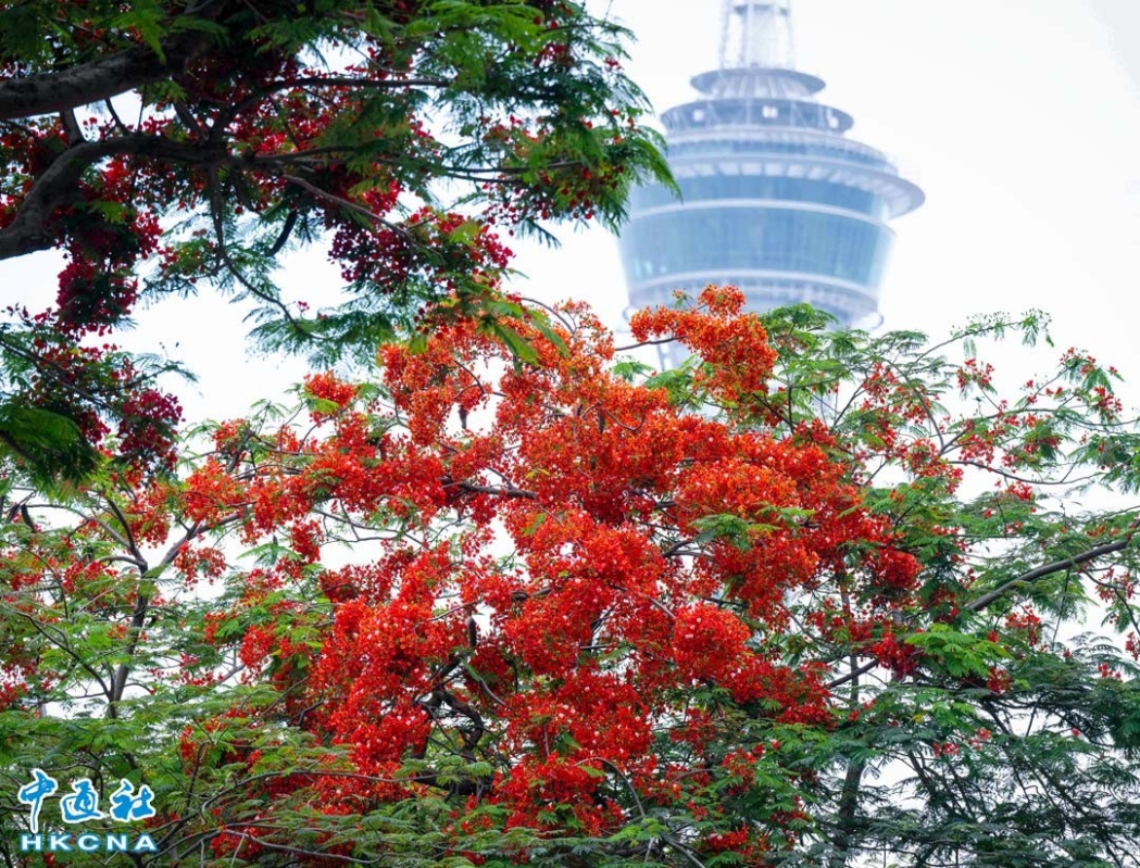 5月10日,澳門多處鳳凰木正開花,媽閣廟前地鳳凰花盛放,吸引遊人拍照片留念。香港中通社圖片