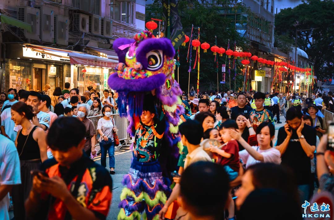 5月11日,為慶祝每年農曆四月初八的“譚公誕”,“閃耀東區夜飛龍”巡遊活動在筲箕灣舉行。夜光舞龍全長逾300米,分10段拼砌而成,運用超過900米長的LED燈串,場面壯觀,現場萬人空巷。圖為醒獅起舞。(香港中通社記者 曹文毓攝)