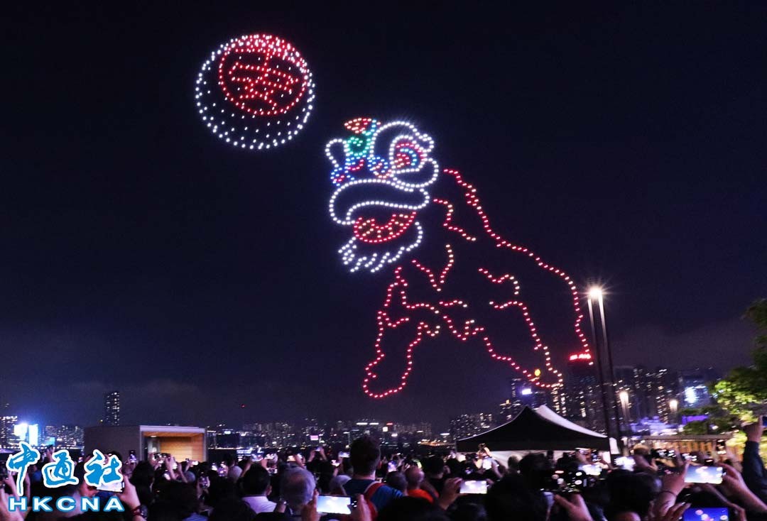 5月11日晚上,香港旅發局在灣仔海濱上演無人機表演,大批市民和旅客到場觀賞。有 1000 架無人機拼出巨型平安包、太平清醮花牌等多幅以傳統節慶為主題的動態圖案,以配合下星期佛誕及太平清醮,向市民和旅客送上祝福。無人機表演歷時大約10分鐘。 香港中通社圖片